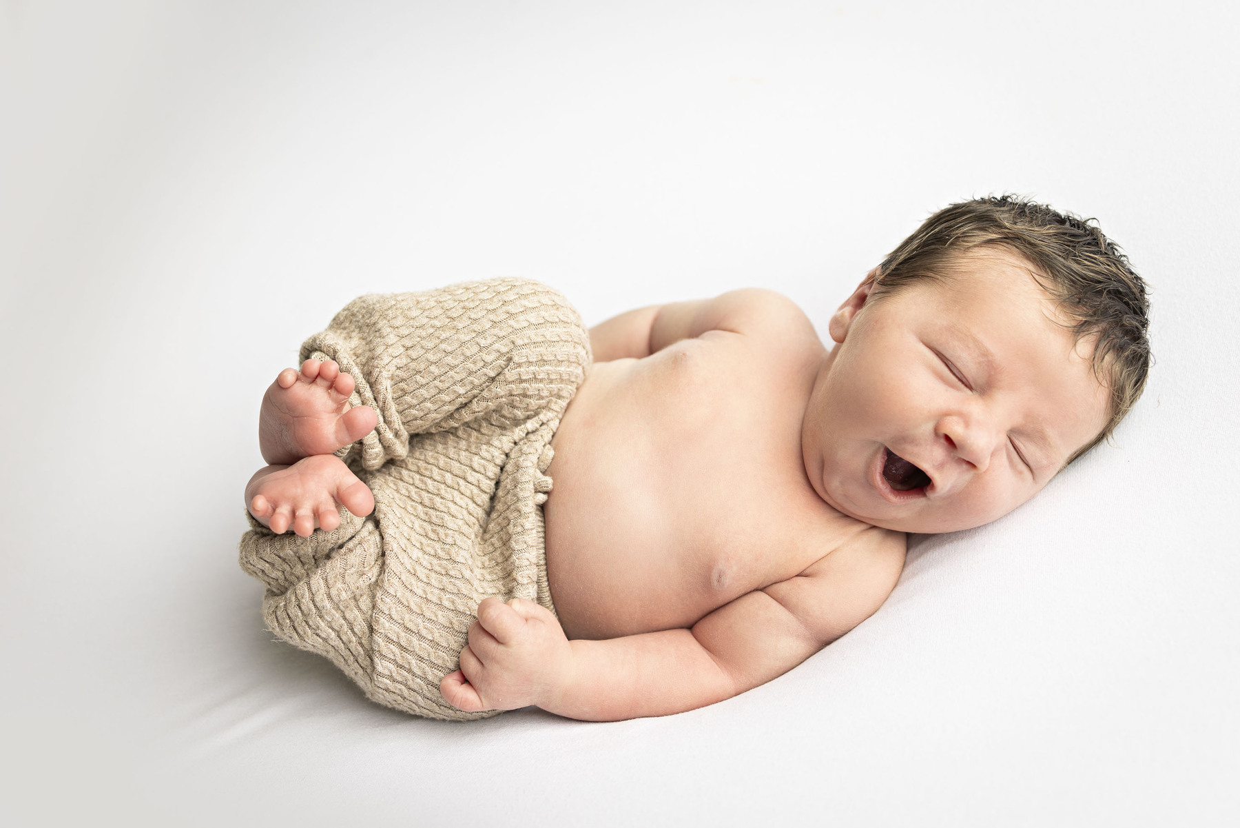 Geen probleem, ook dan kan je bij ons langskomen voor een fotoshoot. Hoe ouder de baby, hoe meer ze gaan bewegen. Daarom kunnen we voor deze baby's geen gebruik meer maken van mandjes en andere attributen, dit puur uit veiligheid van je kleintje. We maken het wel nog steeds knus en gezellig in onze studio!
